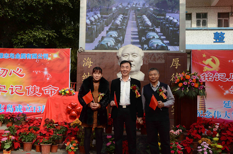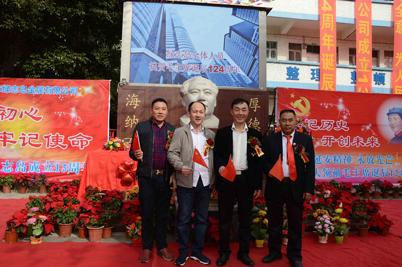 綠志島實(shí)業(yè)由來(lái)自湖南的朱祖生先生創(chuàng)業(yè)于2000年,由最初的錫渣冶煉廠經(jīng)過(guò)十來(lái)年的艱苦奮斗,現(xiàn)在公司產(chǎn)品包括焊錫條、焊錫絲、焊錫膏,助焊劑,清洗劑,防銹劑,潤(rùn)滑油等。綠志島實(shí)業(yè)的發(fā)展,在以毛主席思想為信仰的指引下突飛猛進(jìn),在“吃水不忘挖井人”的感恩心下穩(wěn)步發(fā)展。為了鞏固毛主席思想作為綠志島的信仰核心,綠志島于2012年12月26日從泰山迎接來(lái)毛主席泰山石像,并立于公司內(nèi)部。自此,綠志島每年12月26日都會(huì)齊聚眾多認(rèn)同毛主席的朋友,在綠志島內(nèi)緬懷紀(jì)念毛主席。2017年是綠志島舉辦毛主席誕辰第六年,為此和志同道合的朋友們齊聚一堂,共慶毛主席誕辰。